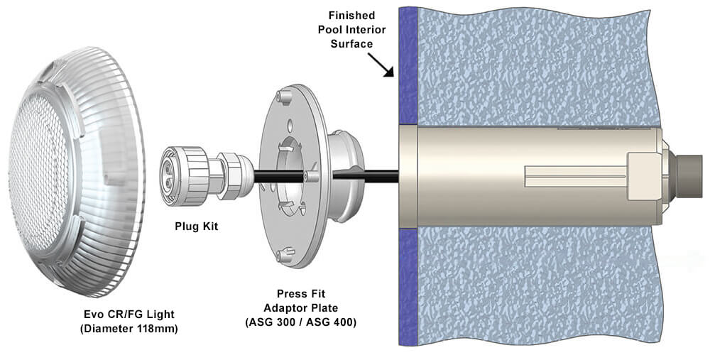 The Aqua-Quip ASG300 Retro-Fit Eyeball Adaptor Plate is designed for seamless integration of EvoFG LED pool lights. With a precise slip-fit mechanism, this adaptor plate ensures a secure and reliable connection for pipes with inner diameters of 48mm–52mm, making it ideal for retrofitting projects.