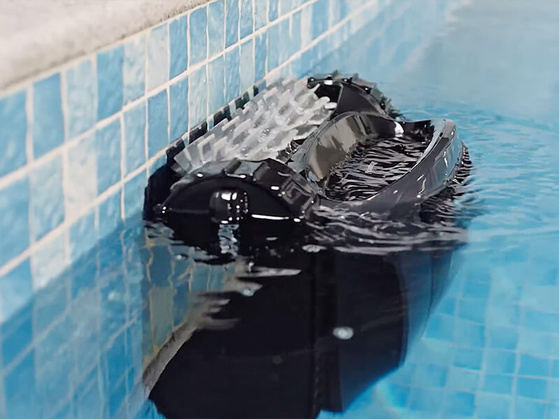 The robot parks at the surface near the pool edge and automatically drains water to make lifting lighter.