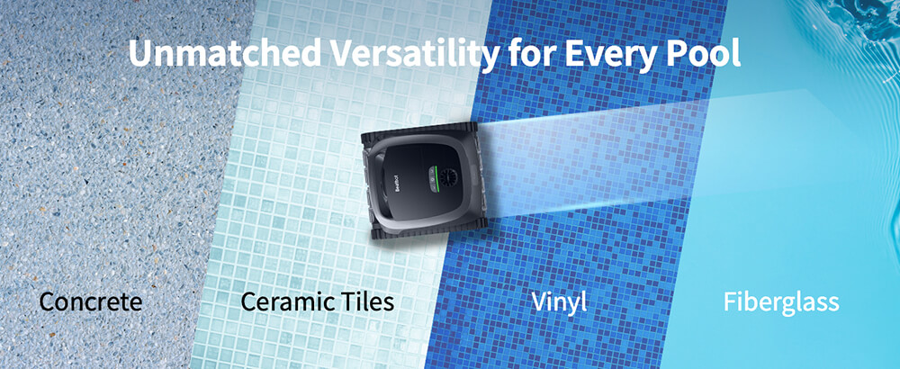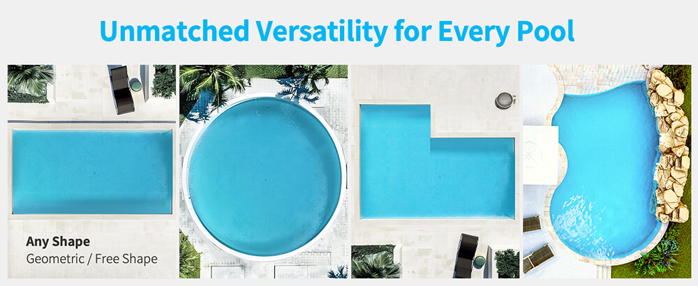 Works in in-ground and above-ground pools of any shape (rectangular, round, kidney, freeform) and on common surfaces (concrete, tiled, vinyl, fibreglass).