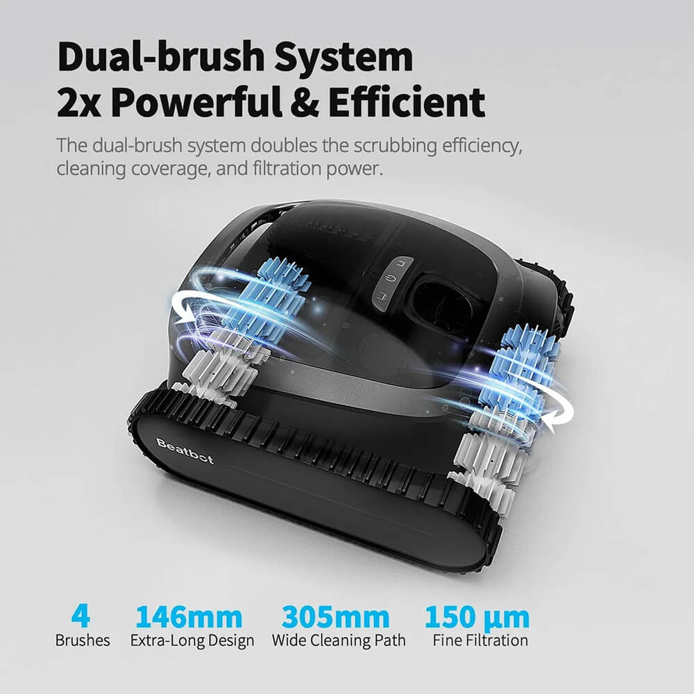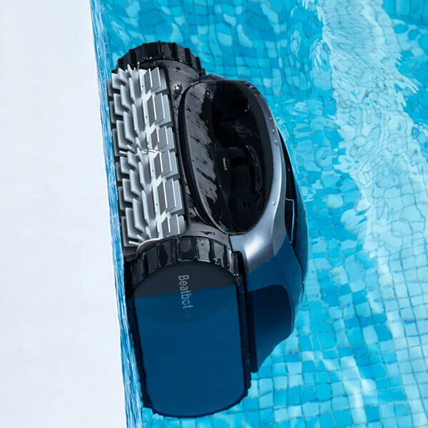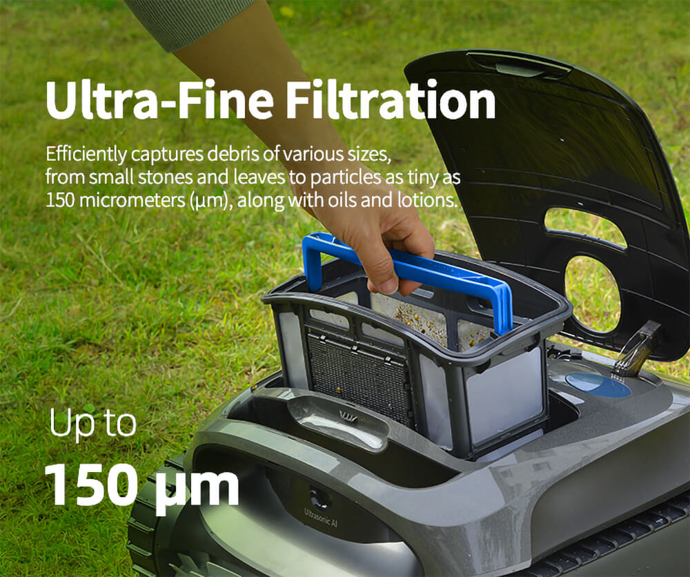 Behind the scenes, SonicSense ultrasonic sensing and CleverNav path planning work together to cover every zone with calm, deliberate passes (S-shape on floors, N-shape on walls and waterline). The dual-group (2×2) roller brushes lift stuck-on grime while fine filtration traps debris so water looks clearer after every cycle. A high-grip tracked drive and strong suction give it the confidence to climb and scrub, including curved/arc walls.