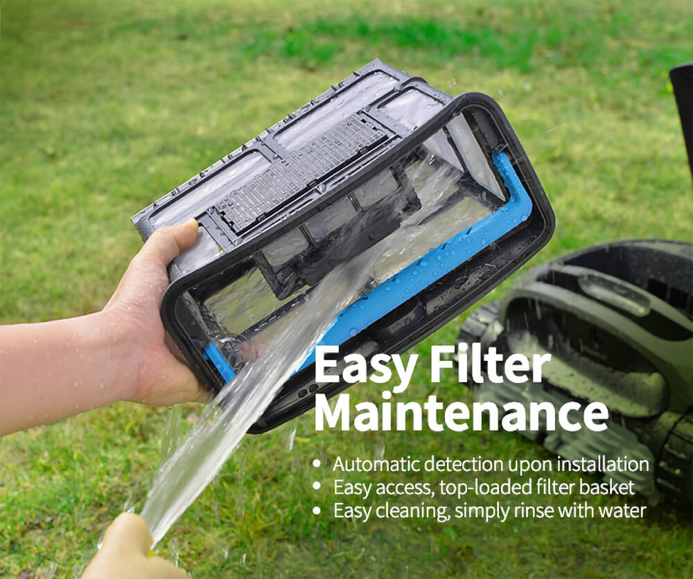 After each use: remove hair/sand from the outlet, tracks, and brushes; clean the filter; and wipe the ultrasonic sensors so they’re unobstructed. Rinse the unit with fresh water, especially after salt or heavily chlorinated use.