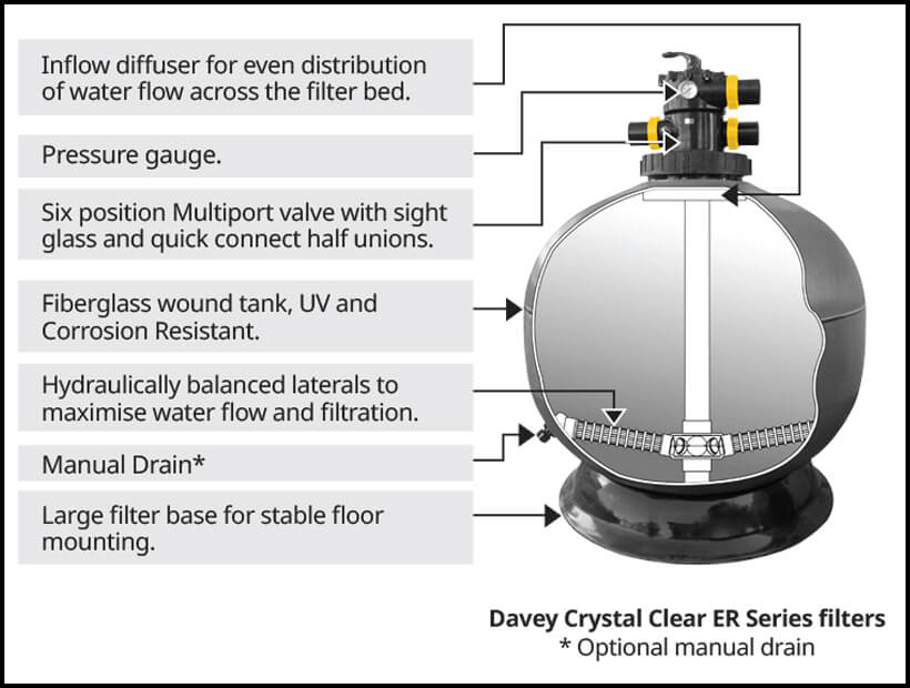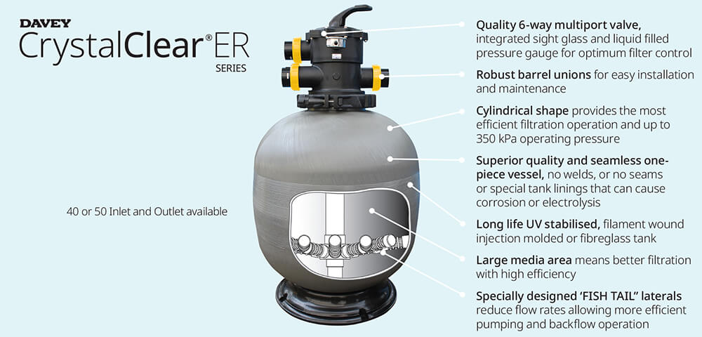 The Davey CrystalClear ER Series brings easy, reliable filtration to everyday pool care. Its premium fibreglass vessel is a seamless one-piece design for long service, while smart Fish Tail Laterals distribute flow evenly through the media for beautifully clear results. With a smooth-action 6-Way Multiport Valve, built-in waste port sight glass, and a liquid-filled pressure gauge, it’s simple to check, backwash, and get back to swimming.