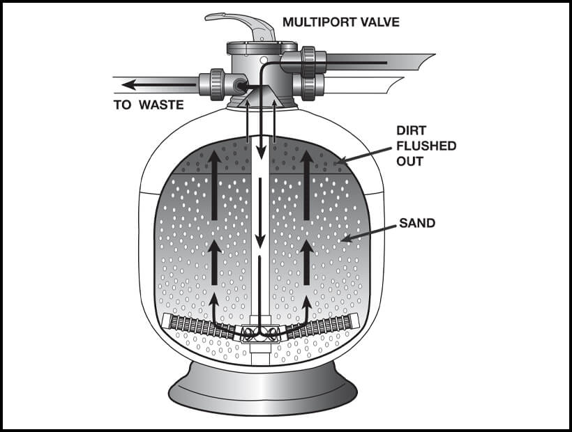 When the pressure gauge is ~50 kPa above its clean (start-up) reading or when water clarity declines. Set the Multiport Valve to Backwash and run until the sight glass water runs clear, switch to Rinse until clear, then return to Filter for normal operation.