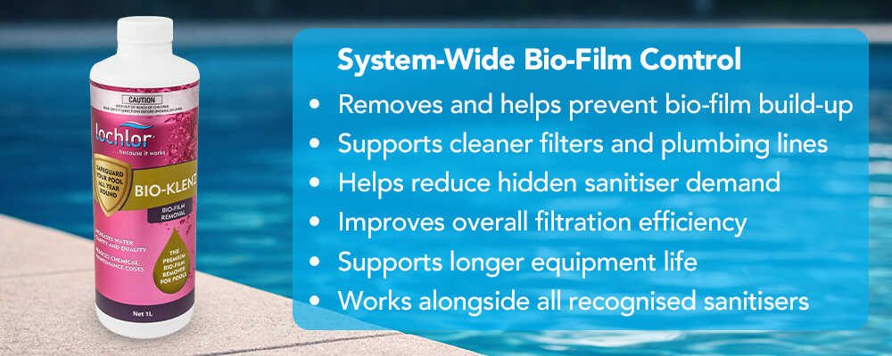 Bio-film is the invisible build-up that forms on pool surfaces and inside circulation lines and equipment. Over time, it can increase sanitiser demand and reduce filtration efficiency. Bio-Klenz works alongside your existing pool care program by lifting this build-up from surfaces and dispersing it into the water so it can be filtered out more effectively.