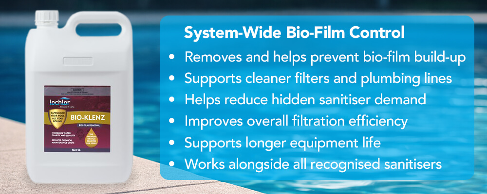 Bio-film is the invisible build-up that forms on pool surfaces and inside circulation lines and equipment. Over time, it can increase sanitiser demand and reduce filtration efficiency. Bio-Klenz works alongside your existing pool care program by lifting this build-up from surfaces and dispersing it into the water so it can be filtered out more effectively.