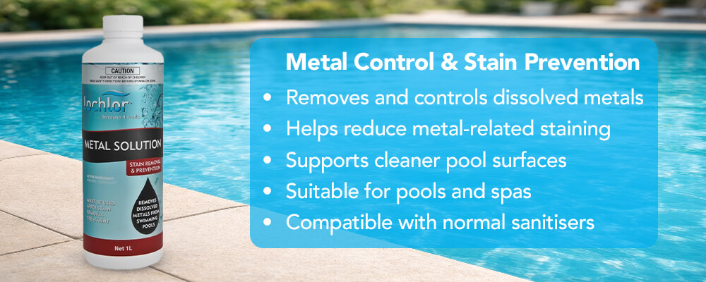 By managing metals such as iron and copper before they settle, it helps reduce staining, minimise discolouration, and support cleaner pool surfaces over time.