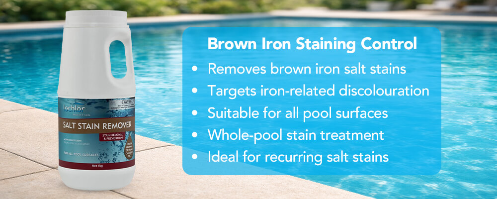 It targets staining associated with iron introduced through salt additions and mineral-rich top-up water, helping restore a cleaner-looking pool finish without harsh surface cleaning.