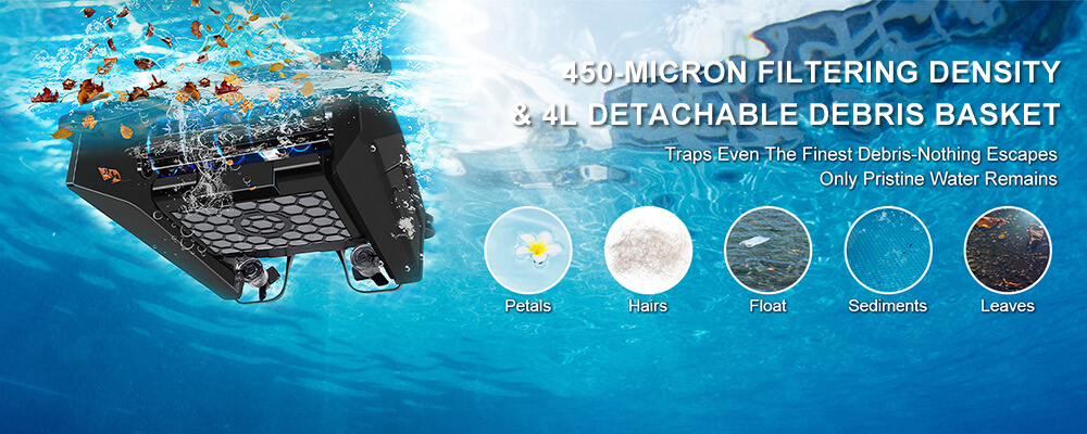 - Efficient Cleaning: Wide-mouth intake and 450-micron filtration capture large leaves, fine pollen, insects, and other floating debris before they sink.