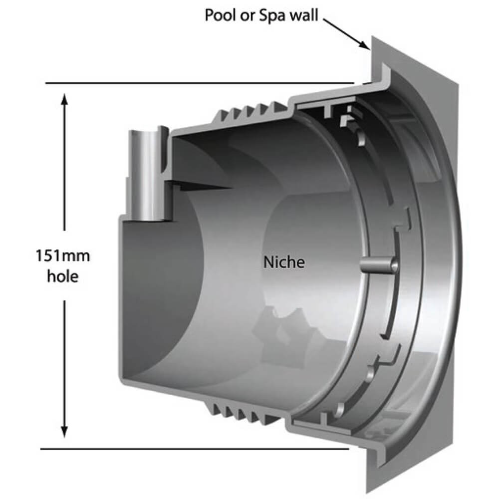 Fibreglass niche with gland and nut for secure installation; requires 151mm hole saw.