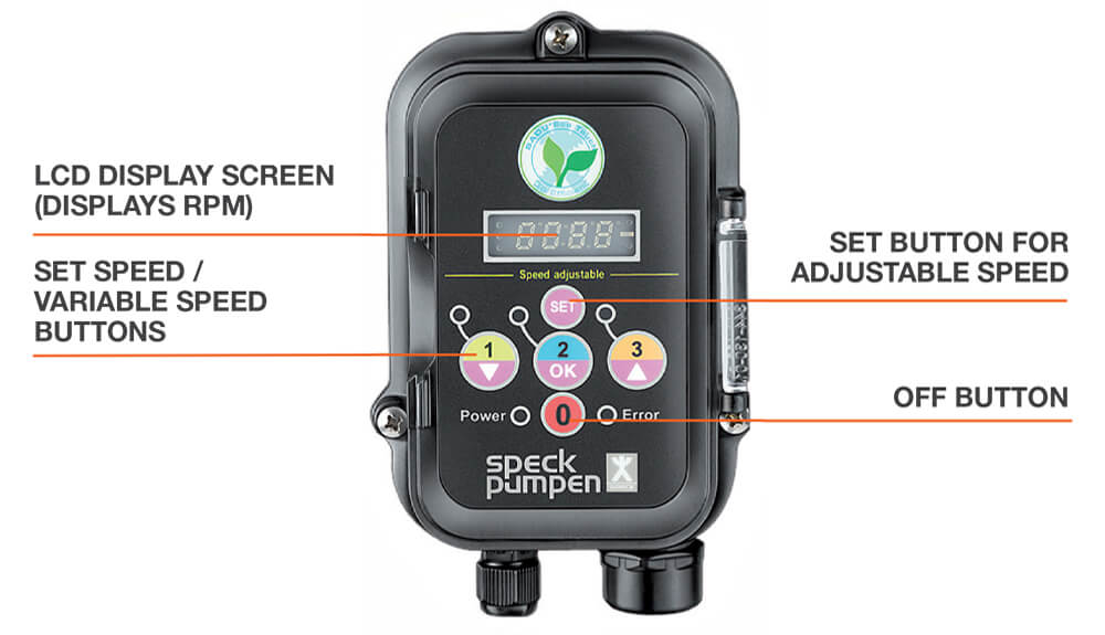 Every start-up begins with a 5-minute high-speed priming cycle, ensuring reliable operation before settling back to your chosen speed. The onboard LCD display shows live RPM, while the LED diagnostics help identify issues such as low voltage, overheating, or overcurrent protection.